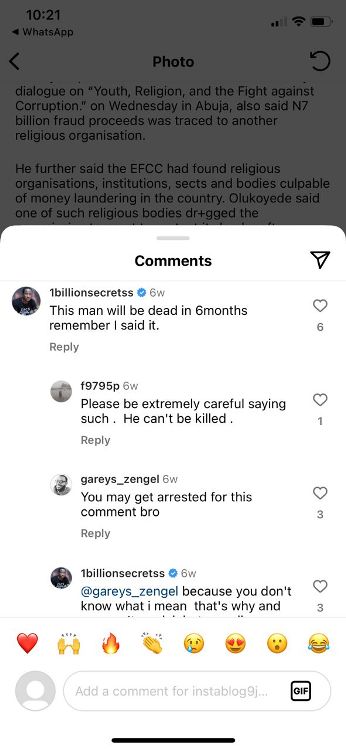 The suspect made the death threat through his Instagram page handle: “1billionsecretss”, while commenting on a story posted by a popular Instagram blogger, Instablog9ja on February 1, 2024.